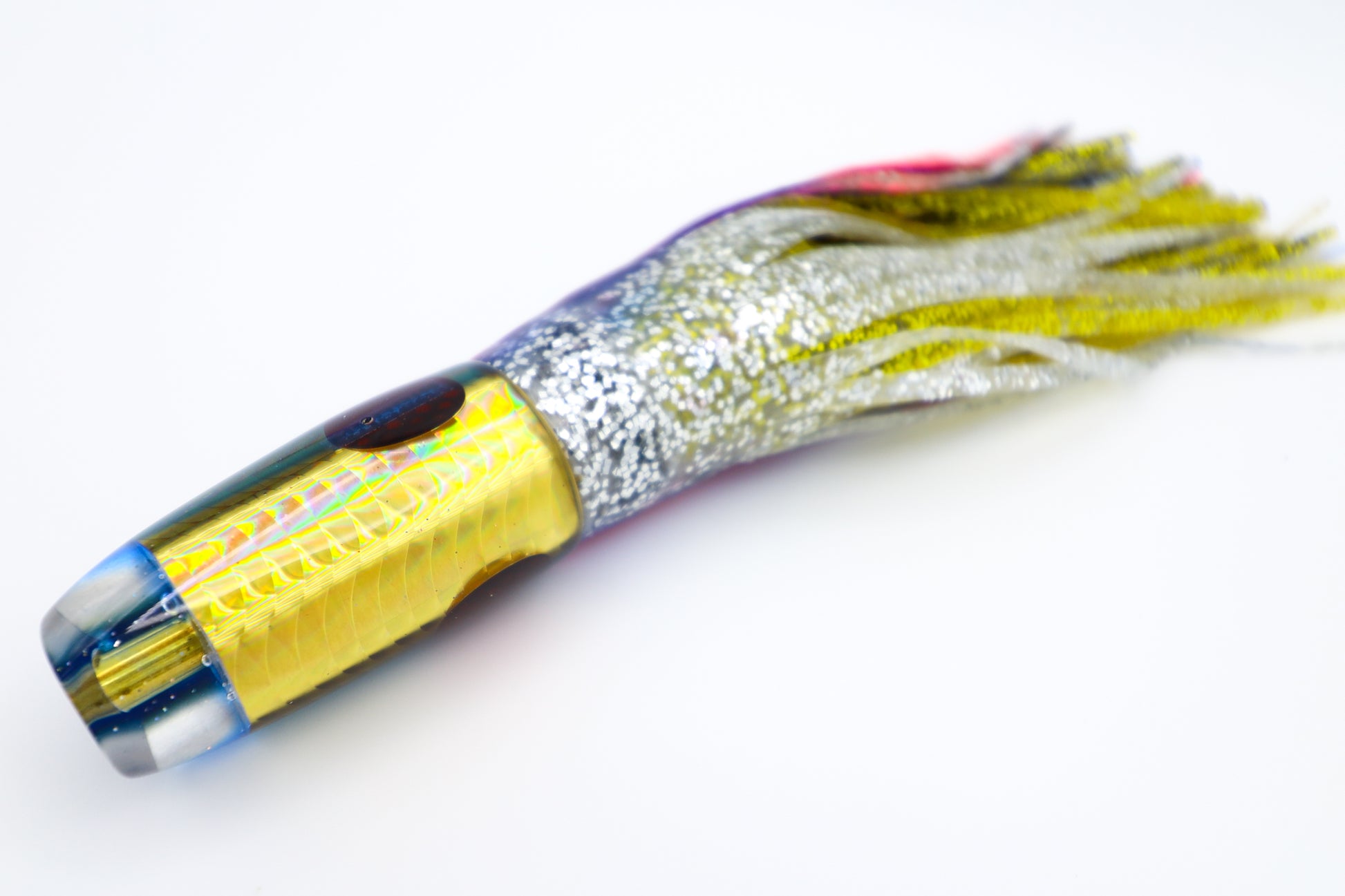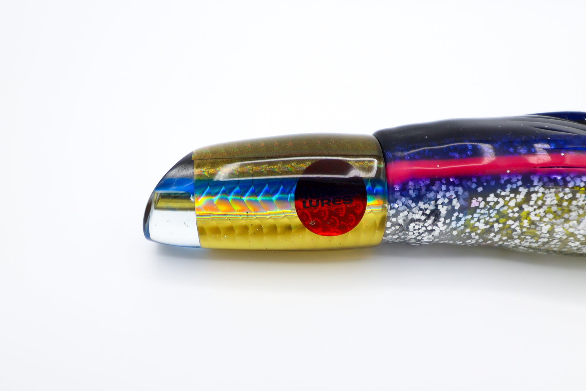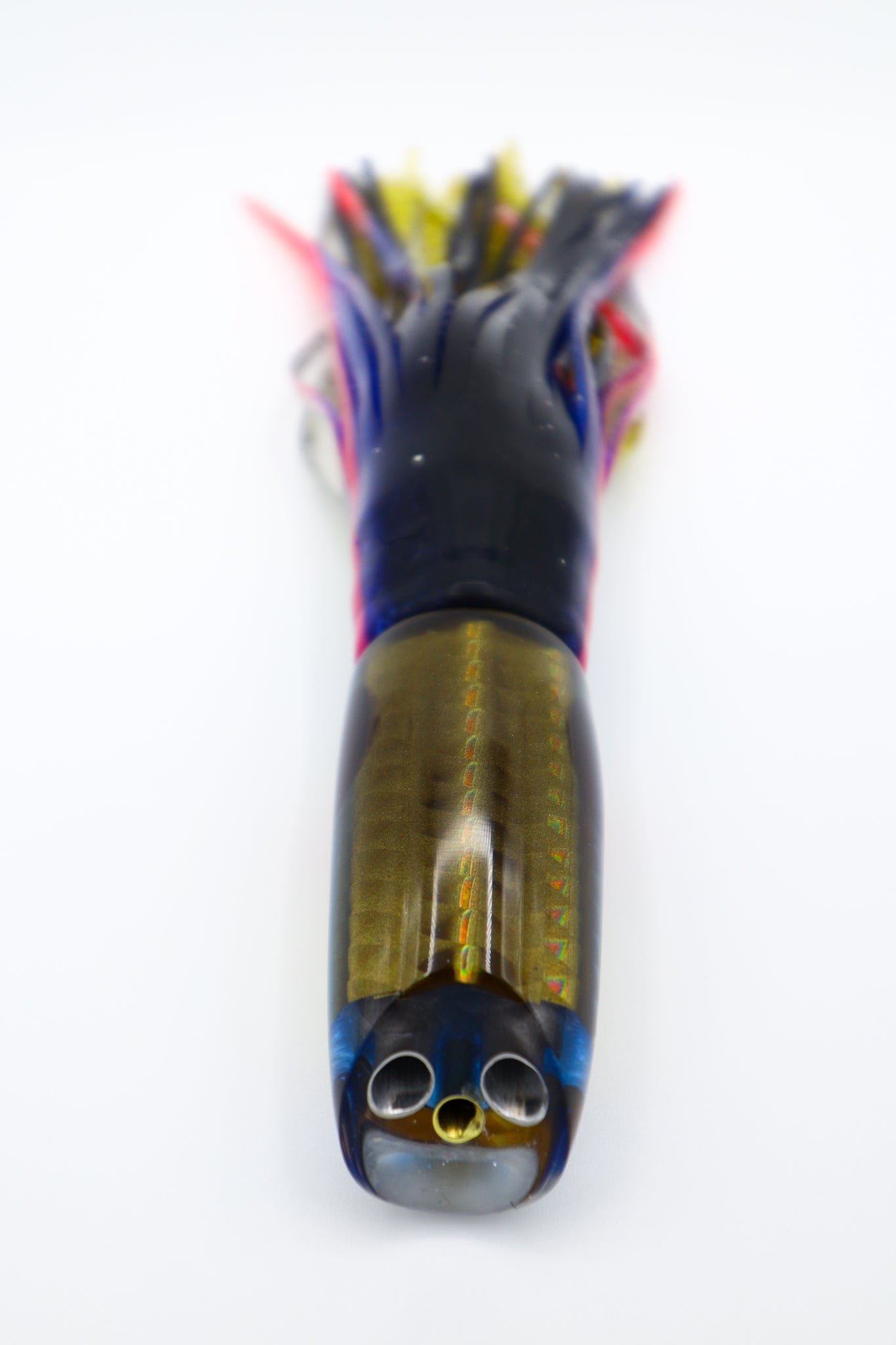 Runs deep and comes to the surface every 3-10 seconds to grab air. The further back the deeper and longer the dive. 6 sided Hexagon lead shape with a very heavy keel weight makes it run true. The scoop in front helps it to dig and stay down. Its an oversized 7" could easily be used as a 9".