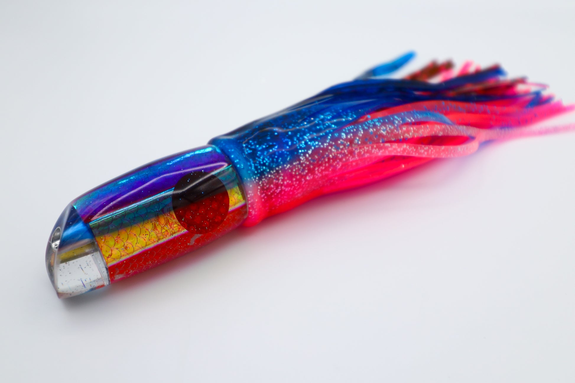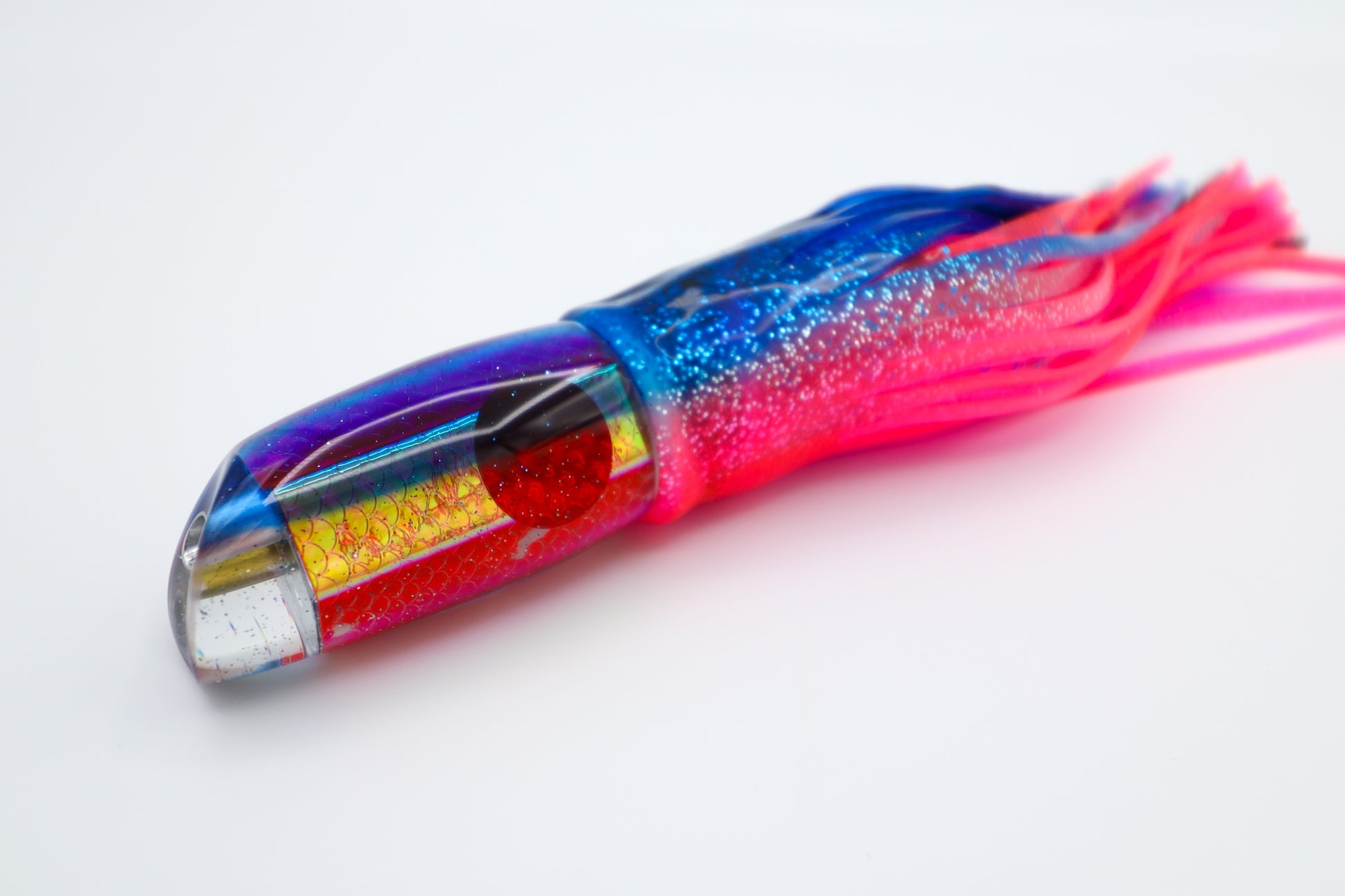 Runs deep and comes to the surface every 3-10 seconds to grab air. The further back the deeper and longer the dive. 6 sided Hexagon lead shape with a very heavy keel weight makes it run true. The scoop in front helps it to dig and stay down. Its an oversized 7" could easily be used as a 9".